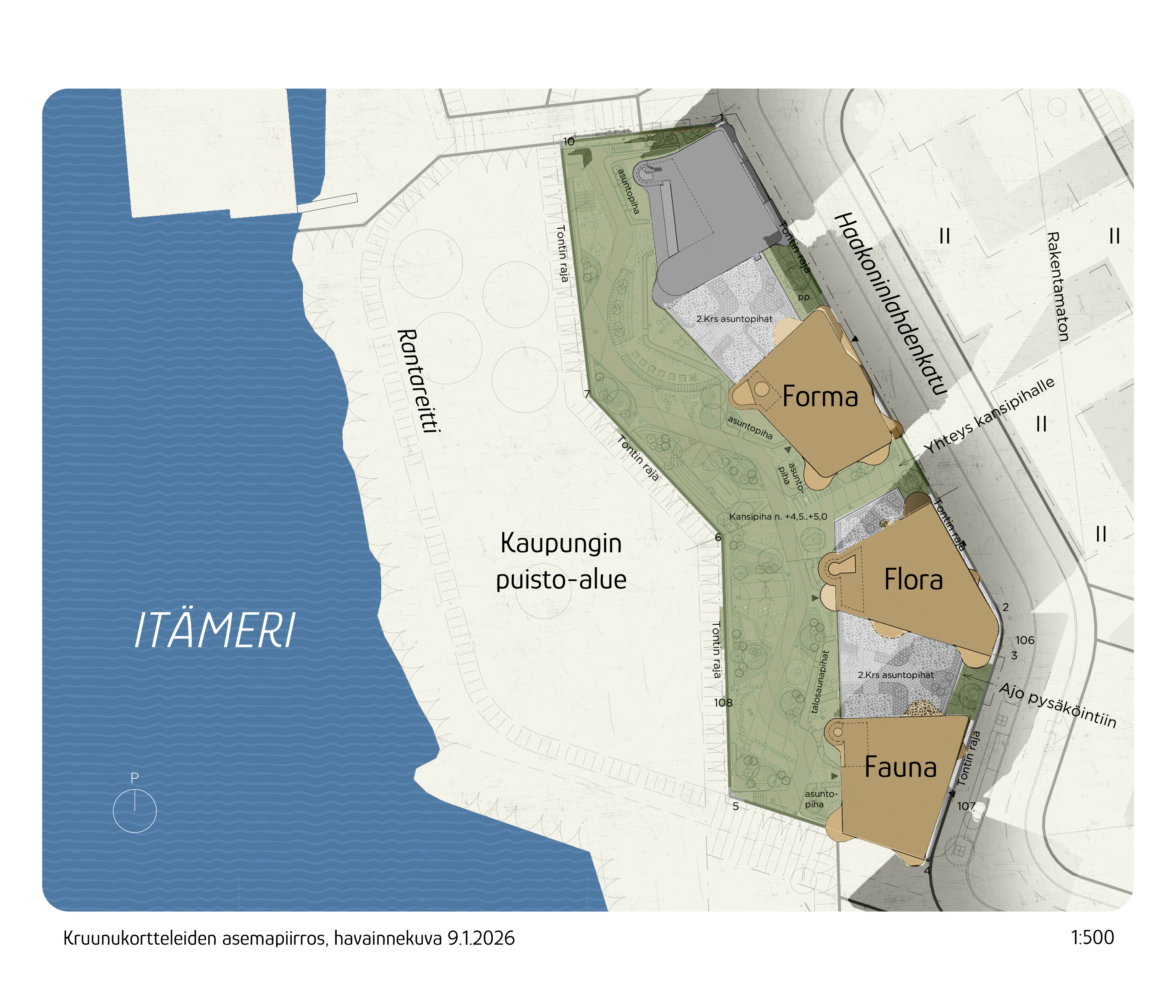 Asuntojen ja parvekkeiden sijoittelussa on korostettu avaruutta ja näkymiä – tavoitteena on mahdollistaa jokaiselle asunnolle näkymä puiston yli ilta-aurinkoon.